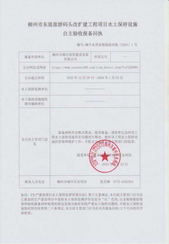 柳州市东堤旅游码头改扩建工程项目水土保持设施自主验收报备回执