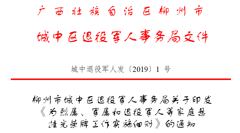 柳州市城中区退役军人事务局关于印发《为烈属、军属和退役军人等家庭悬挂光荣牌工作实施细则》的通知已经区人民政府同意,现印发你们,结合实际认真贯彻执行。请认真组织实施,于 2019 年 4 月 25 日前全面完成光荣牌悬挂工作任务。