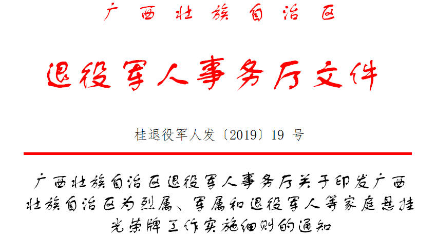 附件:1.《广西壮族自治区退役军人事务厅关于转发为烈属、军属和退役军人等家庭悬挂光荣牌工作实施细则的通知》